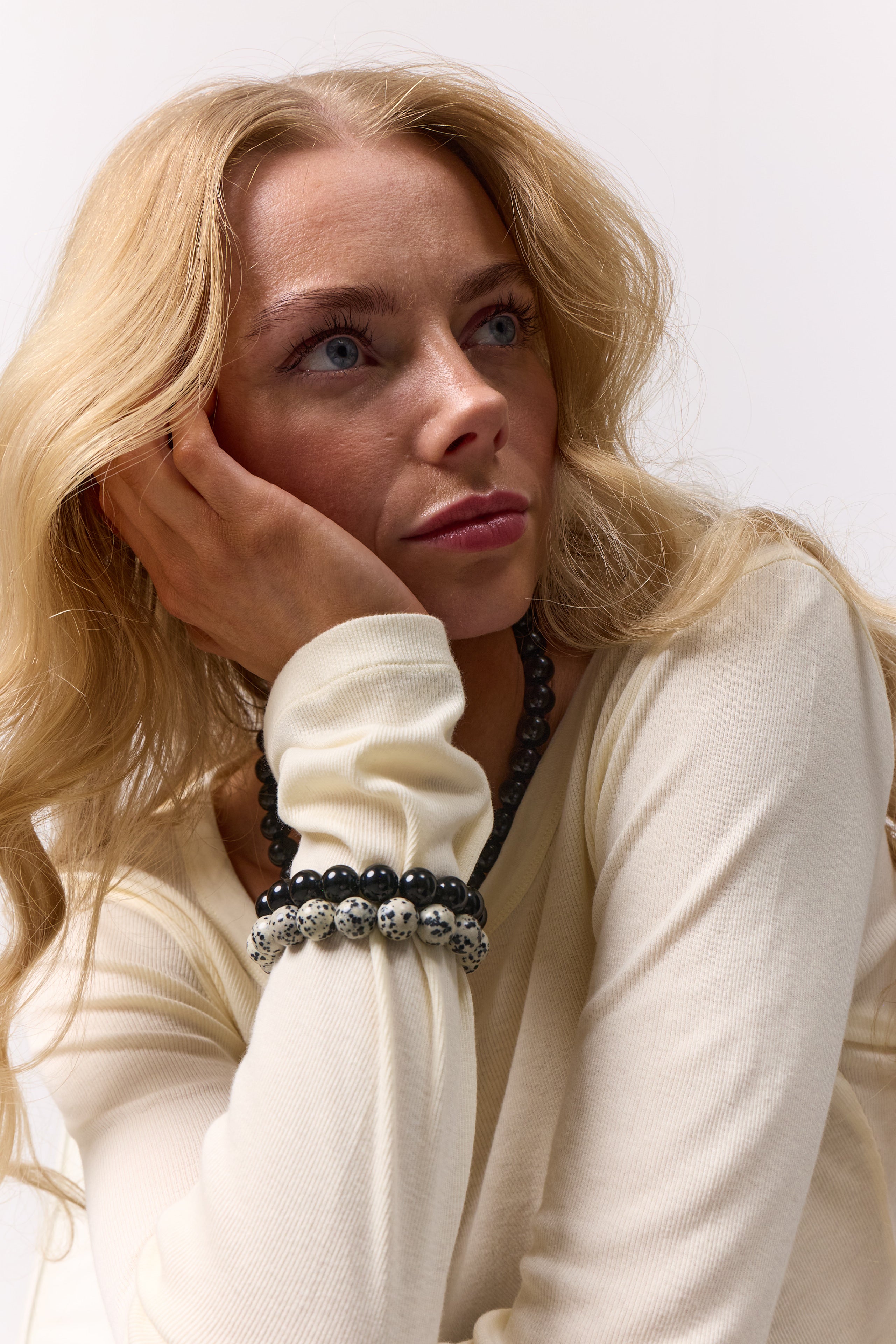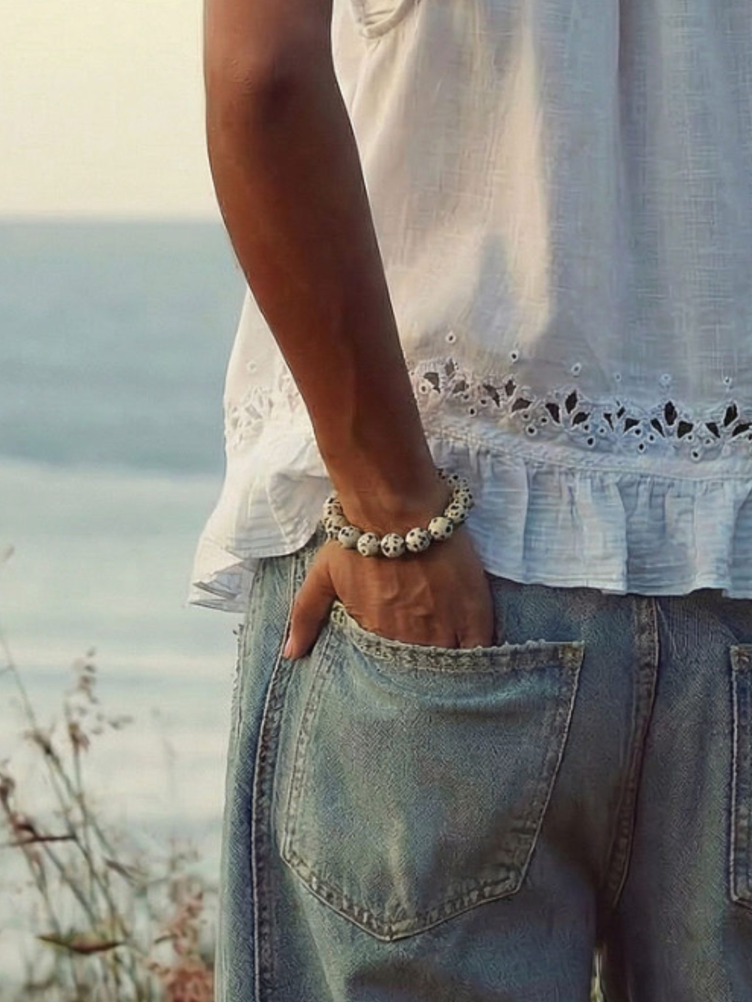 The Chunky Dalmatian Jasper Stretch Bracelet is designed to bring joy, lightness and playful energy into your everyday life. Dalmatian Jasper is associated with positivity and is believed to enhance your ability to see life in a positive light.
