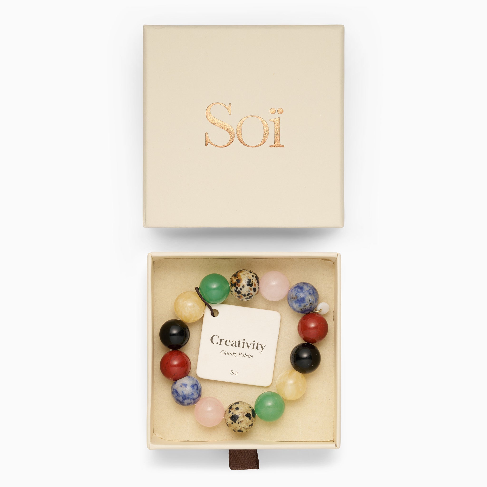 The Bold Palette Bracelet is designed to awaken your inner creativity and fill you with new energy. The combination of the many colorful stones creates a vibrant palette that symbolizes playful creativity and strength in everyday life. The bracelet consists of Green Aventurine, Dalmatian Jasper, Rose Quartz, Blue Point, Red Jasper, Black Onyx and Honey Jade.